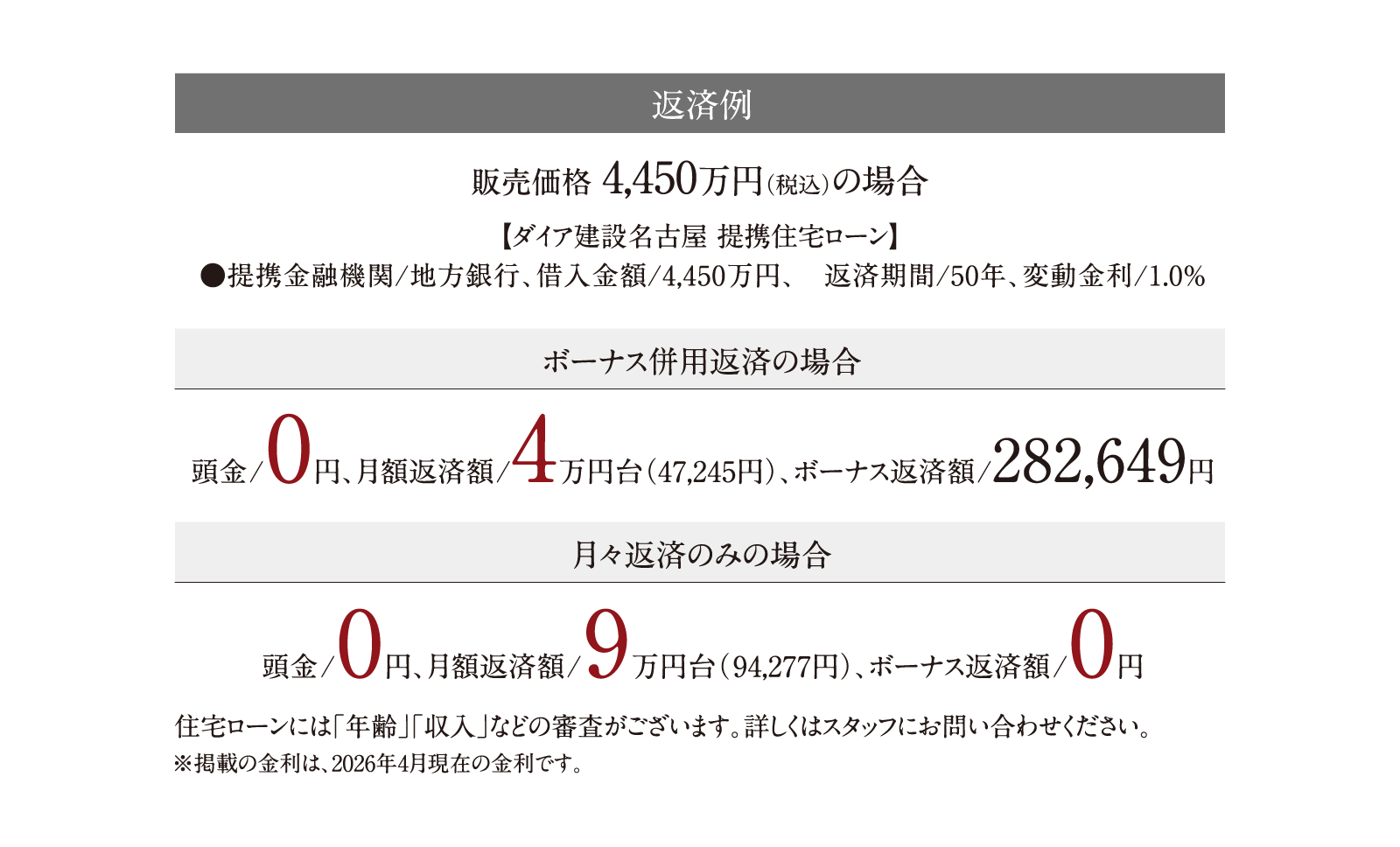 ●提携金融機関/地方銀行 ●融資期間/1年以上50年以内(1年単位)●借入申込資格/○借入時年齢20歳以上70歳未満で、完済時年齢が79歳までのお客様(50年ローンの場合、ご加入時年齢は29歳までとなります)○団体信用生命保険に加入できるお客様○収入、勤続年数、その他の借り入れの有無、過去の延滞履歴の有無など審査条件がございます●利率/年利1.0%(変動金利・店頭表示金利より優遇金利を適用後)●諸費用が別途必要になります。※掲載の金利は2026年4月現在のものです。 ※詳しくはスタッフにお問い合わせください。