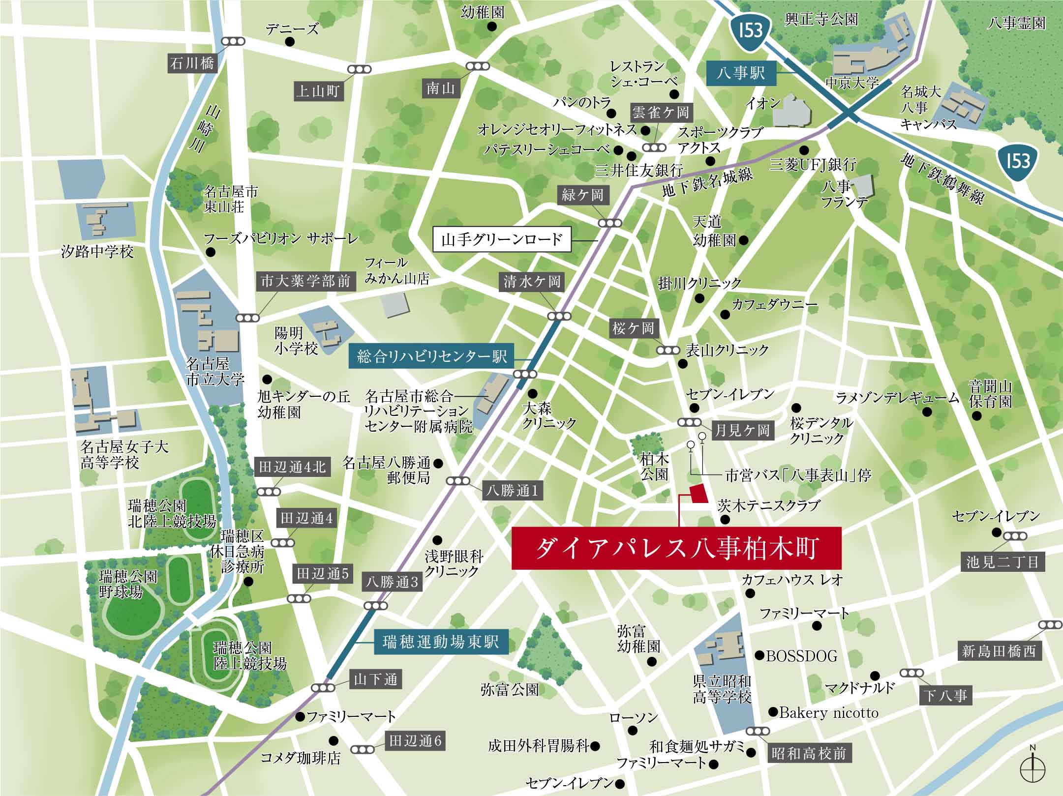 徒歩3分の市バス「八事表山」からは八事12系統で「八事」駅をはじめ、その先の今池や千種駅方面へのお出かけもスムーズに。また、地鳴.瑞系統や瑞穂巡回系統の2路線を利用すれば、さらに行動範囲が広がります。
